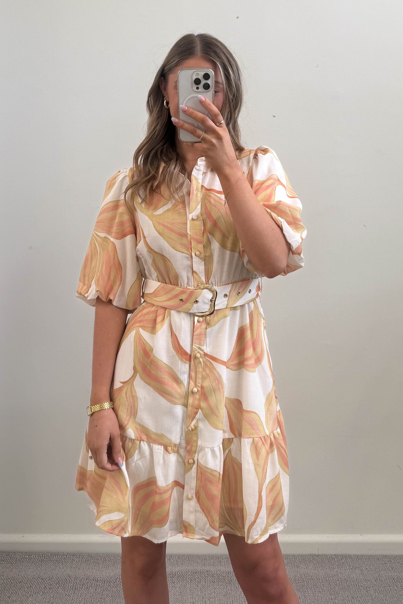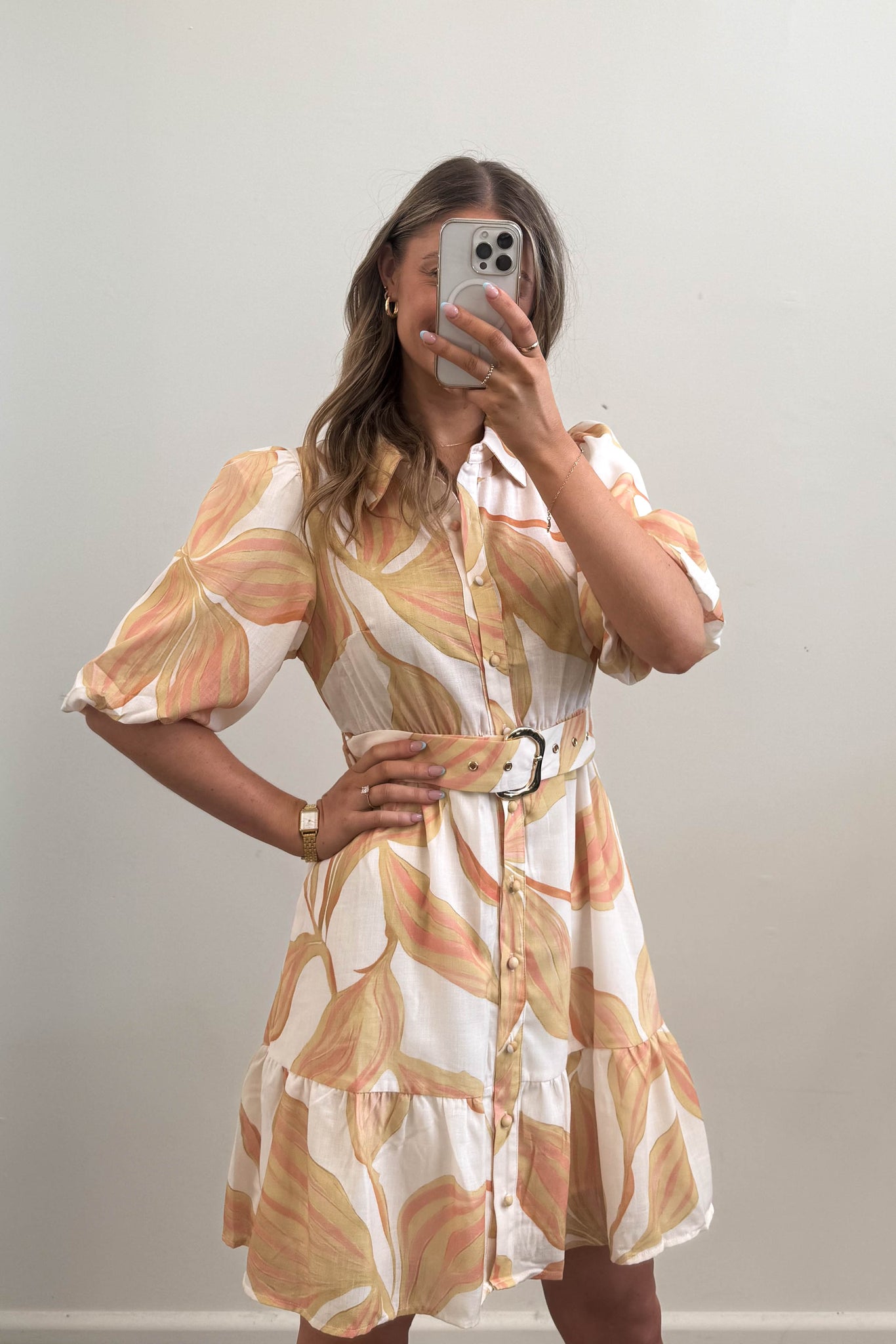 - Gold hardware detail on belt