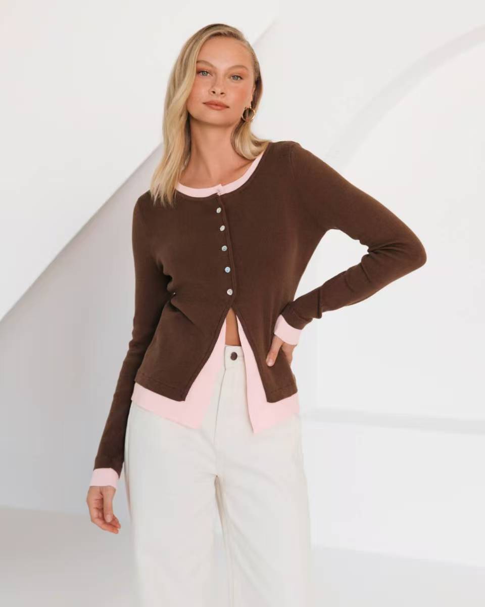 A cozy brown and pink knit cardigan designed for effortless layering. The warm brown base is beautifully complemented by soft pink tones, creating the perfect balance of comfort and charm. Easy to style and even easier to love.