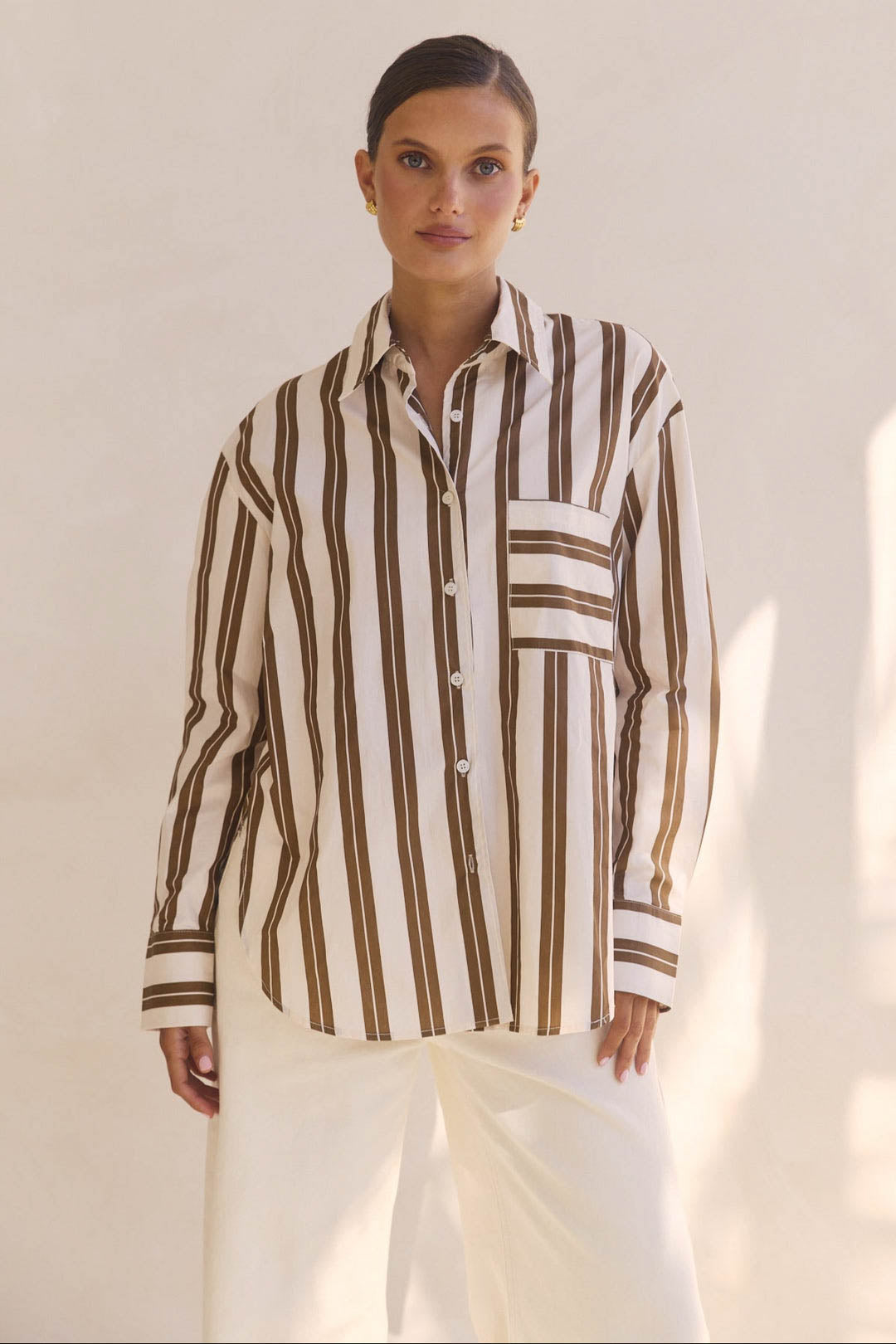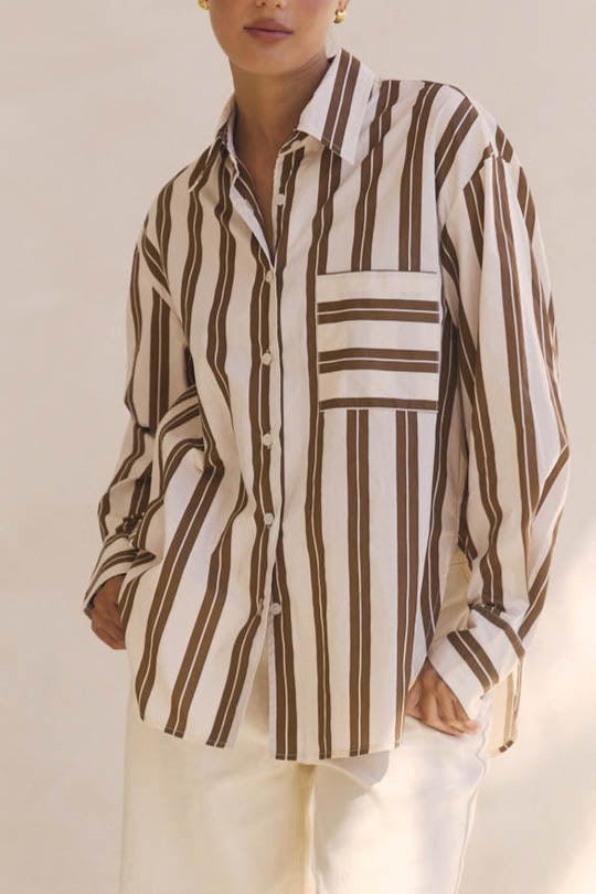 Elevate your wardrobe with the effortlessly chic Mirelle Shirt in Cream Brown stripes.