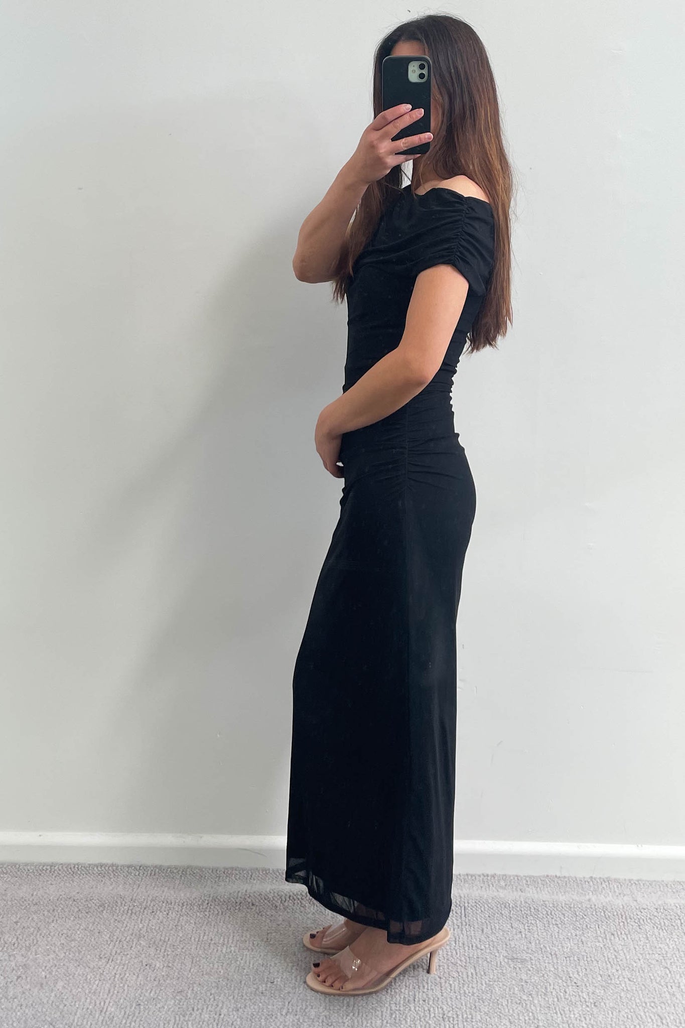 The Winnie Mesh Maxi Dress in Black is sleek, bold and ready to impress. Perfect for evening events or cocktail parties, this asymmetric design brings dramatic elegance with its off-the-shoulder neckline.